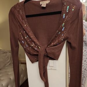 Chic Shrug with shimmering sequin details. Features a stylish tie-front. Beautiful Chocolate