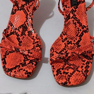 Preloved good condition Olchee Square Toe Snake Embossed Strappy Heel Sandals in Neon Orange size 40 or 9 3in