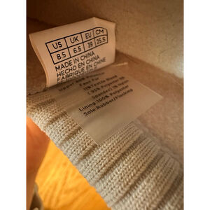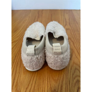 The exterior of the shoes is covered in a cream-colored faux fur material. The interior features a ribbed knit lining. The soles are rubber with the TOMS logo. They have only been worn a couple of times and are in excellent condition.