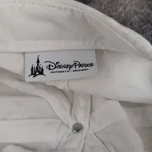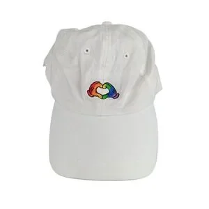 Disney Parks authentic original white baseball cap. Features a colorful rainbow heart formed by two hands embroidered on the front. Adjustable strap with buckle closure for a custom fit. Perfect for a day at the theme park, casual outings, or showing support for LGBTQ+ pride.
