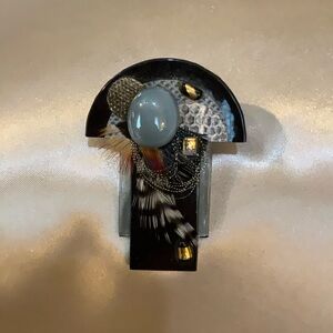 Stylish brooch featuring black and gray tones with feather accents and Moonstone gem. Perfect for adding a unique touch to any outfit.