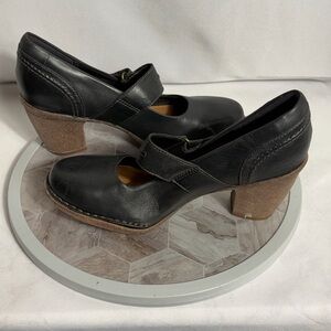 Clarks Artisan black leather Mary Jane heels with an adjustable hook-and-loop strap and comfortable block heel. Classic round toe design with soft cushioned insole and sturdy cork-textured heel. Great everyday comfort shoe with a dressy casual look. Preowned with normal signs of wear including scuffing on toes, heels, and soles, but overall still in good usable condition.