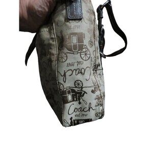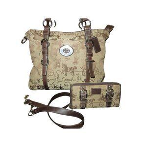 This Coach Chelsea Horse and Carriage Satchel Handbag set features a stylish 3-piece design with a handbag, coin pouch, and wallet. It comes in an attractive brown and tan color combination, made from high-quality canvas and leather. Perfectly sized at 11 X 13, it's an ideal accessory for women.