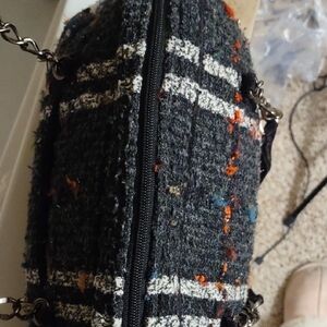 Chic shoulder bag with a stylish plaid design. Features chain and fabric straps. Ideal for versatile use. This bag is so unique and versatile.