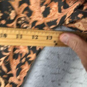 Color: Black base with warm orange paisley and floral pattern.