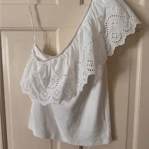 Add a breezy, feminine touch to your summer wardrobe with this white one-shoulder top from Old Navy. Featuring an elastic neckline with a delicate spaghetti strap and a scalloped eyelet ruffle overlay, this top combines comfort and charm. The ribbed knit body offers a soft and flattering fit. Perfect for warm days, beach outings, or casual nights out. Size Large. Excellent condition with no flaws.