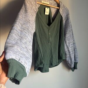free people sweet confession henley top with V neck, raglan gray color sweater sleeves , rounded hemline, size Medium, dried pine combo color.