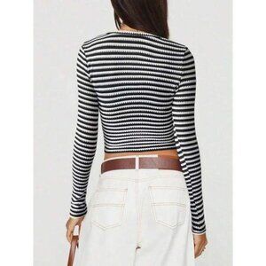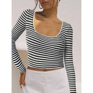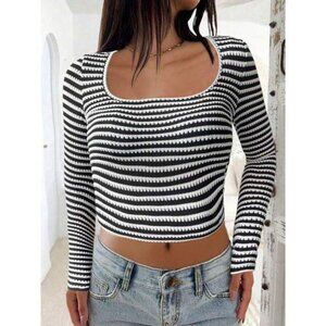 Women's Striped Knit Tops Casual Slim Fit Stylish Square Neck Long Sleeve Crop T