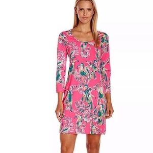 Lilly Pulitzer Vibrant pink dress with tropical bird patterns.