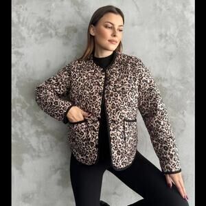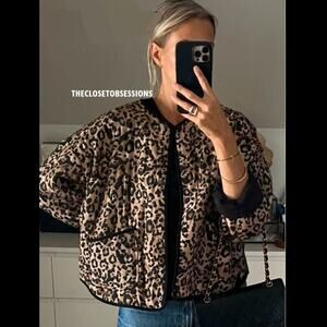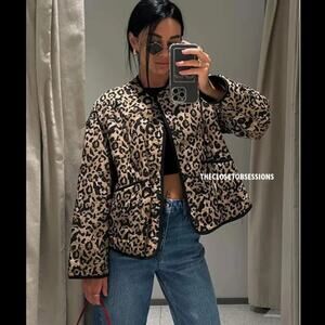 Leopard print padded jacket. Round neck and long sleeves. Front patch pockets. Front snap button closure. From ZARA, in size L. New with tags. Sold out in stores.