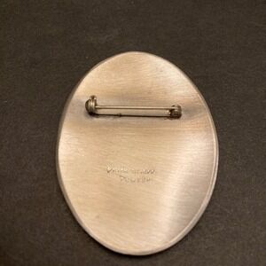 Kirk Stieff Pewter Brooch "Autumn". Oval and featuring a floral basket etched into the metal, it measures about 2.25" tall and 1.5" wide. Comes with the original box and paperwork.