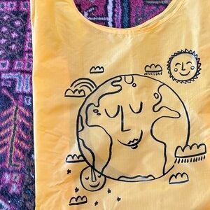 Fun yellow tote with playful earth print. Compact and easy to carry.