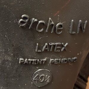 Elevate your style with these Arche boots that feature a solid black pattern and a knee-high shaft style. The almond toe and mid-height heel provide comfort for all-day wear, while the zip closure and accents add a touch of elegance. These boots are perfect for any occasion, from travel to business, and are made with high-quality materials including genuine suede and leather lining. The latex outsole ensures durability and longevity, and the regular calf width and standard shoe width provide a comfortable fit. Available in EU 40.5, US shoe size 9, heel height 3” inches, shaft height is 15” inches, calf width is 14” inches, these boots are a must-have for any fashion-forward woman. Fit a little tight. In excellent worn once boots.