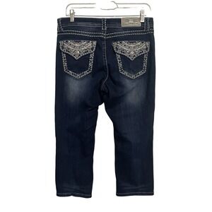 Keywords: Grace Jeans, womens jeans, size 29, dark wash denim, bootcut, embellished pockets, distressed, western, country, fashion denim, designer jeans, casual wear