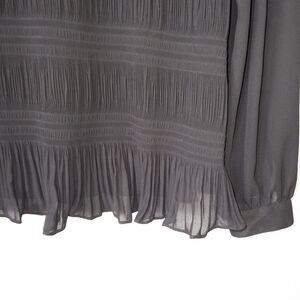 Description/Details: Pleated panel front. Button back. Ruffle hemline. Long button sleeves.