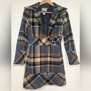 dELiA*s Vintage Junior's XS Blue Brown Plaid Pea Coat Wool Blend Y2K 90s
