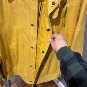 Stylish yellow leather jacket with a sleek design. Features a front pocket and buttoned cuffs.