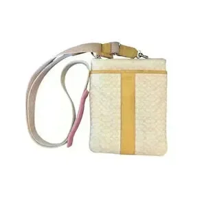Coach Signature C crossbody bag that’s Pink and cream with leather. The straps are adjustable with a leather pad for comfort.