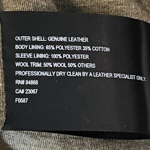 FABRIC: Outer Shell: 100% Genuine Leather; Sleeves: 50% Wool, 50% Others; Lining 65% Poly 35% Cotton, Sleeve Lining: 100% Polyester