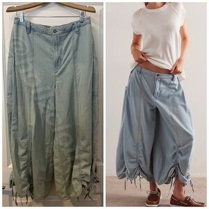 NWOT Lily Fields Cinch Jeans by We The Free from Free People. Color: Liquid Sky (light blue denim). Exaggerated wide leg silhouette. Mid rise. Zip fly and button closure. Side pockets. Belt loops at waistline. Pleated paneling at hips. Adjustable cinch detailing at the hem. Cropped length. Flattering seaming throughout. Lightweight denim. 82% Cotton and 18% Linen. Current style and color on Free People’s website, get it here for less! Sold out size. Brand new without tags, never worn. Plastic hanging barb still intact, just no paper tag attached. MSRP $128. Size M. Please see measurements for better fit.