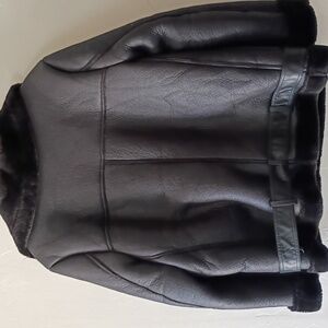 Stylish black faux shearling faux leather jacket with zipper and belted detail. Features a belted waist with plush inside and plush collar. Never worn. Flattering Style. I ordered this online and it came wrapped in packaging with the skew information. I opened it but never wore the coat. It did not have a tag attached when it arrived.