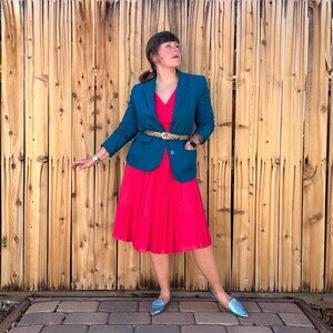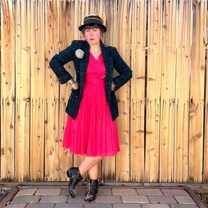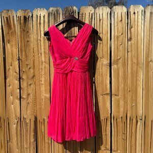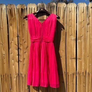 Vintage 60s Dress Fit Flare Chiffon Hot Pink Fuchsia Sleeveless V Neck Size M/L