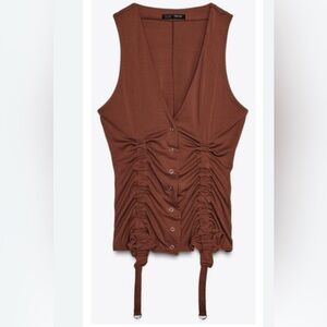 Chic sleeveless blouse with ruched sides. Button-down front. Stylish and versatile.