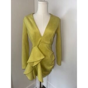 Turn heads in this stunning Fashion Nova lime green mini dress. Designed to flatter your figure, this dress features a daring V-neckline and long sleeves, creating an elegant silhouette. The ruched detailing on the side and the cascading ruffle accent add a touch of playful sophistication, while the bodycon fit ensures a confident and chic look. Perfect for a night out with friends or a special date.