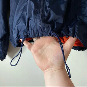 • Colorblock with wind breaker like material, navy, orange and golden retro style track / biker jacket with mesh lining and adjustable waist. Neckline has double snap buttons for closure. Wind-breaker like material. Zip up closure
