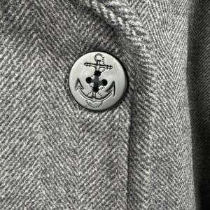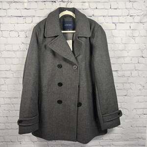 This Lands' End Men's Wool Blend Double-Breasted Peacoat features a sophisticated gray herringbone pattern, perfect for adding a touch of classic style to your wardrobe. Made from a durable wool blend (65% wool, 30% polyester, 5% other fibers), this peacoat offers warmth and comfort. Key details include a double-breasted closure with anchor-embossed buttons, a classic wide collar, and two spacious front pockets. The inner lining is 100% polyester for smooth wear, and the upper lining includes 63% wool and 37% viscose for added warmth and quality. Originally made in China, this item is new with tags, making it an excellent addition for the colder months.