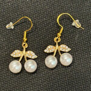 Petite Pearl Cherries Pierced Earrings White Glass Pearls are set in Gold Tone metal to form a beautiful double cherry pierced earring Leaves are clear rhinestones The backs of these are equally attractive Fish Hook pierced ear wires with clear back stoppers Newly made. Never worn A great gift idea Approx. 3/4" wide by 3/4" long