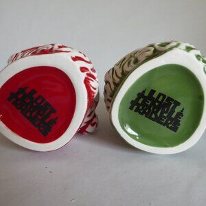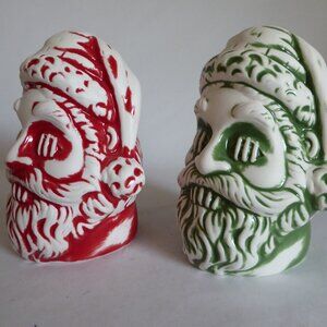 New in boxes, 2020, Lost Temple Traders, ceramic tiki mug entitled “Shrunken Santa Head”. “This is a mug shaped like a shrunken head version of Santa Claus. It is glazed with a wipe red finish. It was sold as a set with a green wipe finish version.” They come in their original boxes.
