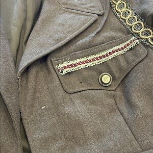 Vintage up cycle World War 2 wool jacket. Stylish military-inspired jacket in olive green. Features gold accents and decorative fringe. Bulket casting buttons- one of a kind handmade for a fashion week in Cleveland/. see pictures for moth holes . Good trim , tapestry back patch and embellished cuffs .
