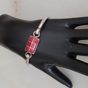 This beautiful sterling bangle features a grid of inlaid coral measuring 3/4 of an inch by a half an inch. it has a hinged hook catch. The interior measures two and a half inches. It weighs a little over an ounce.