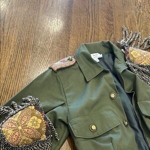 Punted military shirt into a one of a kind coat. embellished with gold and black trim , tapestry , removable tassel’s shoulder embellishments. Also handmade bullet casing buttons used . Stand out with this unique embellished jacket featuring a striking green top and a vibrant multicolor patterned bottom. Perfect for adding a touch of flair to any outfit. also fully lined . it’s a smaller size 0-2