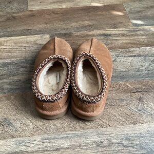 Comfortable UGG slippers in tan suede. Features a patterned trim and plush lining.