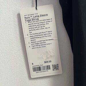 Sleek black bolero jacket. Long sleeves. Perfect for layering.Buttery soft Nulu fabric feels weightlessly light and sweat wicking and four way stretch .Added Lycra fibre for stretch and shape retention.Very flattering.