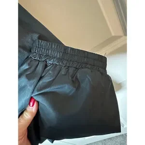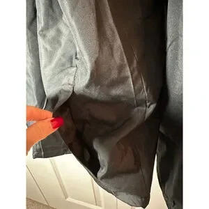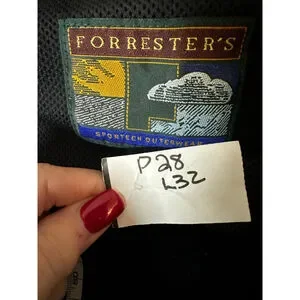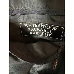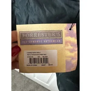 This is a new with tags Forrester's Men's Performance Rain Suit in black, size XXL. The jacket features a full-zip front, a stand-up collar, and elasticized cuffs with adjustable drawstrings at the hem. It is made of 100% polyester for both the shell and lining, and is designed to be waterproof and packable. A zippered pocket is visible on the back of the jacket, which also serves as a storage pouch for the packable design. The suit was made in China.