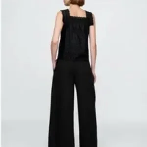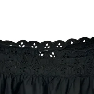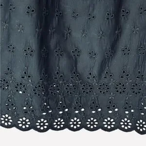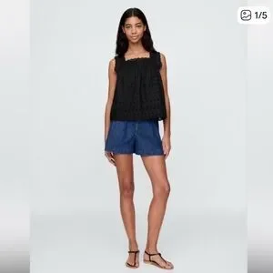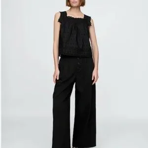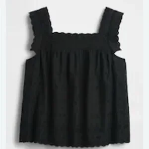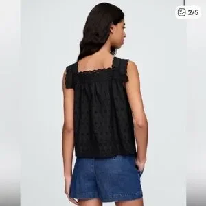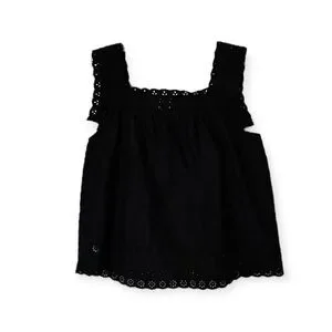 Chic black tank with eyelet design. Sleeveless and stylish. Perfect for casual outings.