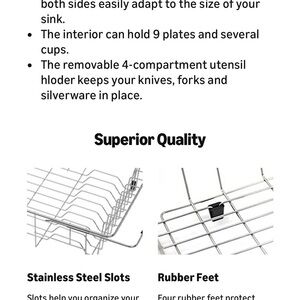 This utensil drying rack has 4 divided compartments to separate & organize your kitchen utensils. Tight bottom mesh prevent silverware from falling through. It holds plates, cups, pots/pans, knives, dry or rinsing vegetables & fruit. It has a non slip extendable rubber arms to keep rack from falling in the sink & four rubber coated feet to protect your sink & countertop from scratching. It is Brand New!