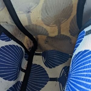 Stylish tote with blue fan pattern. Durable black handles. Perfect for everyday use. The outside is in excellent condition. The inside does have staining.