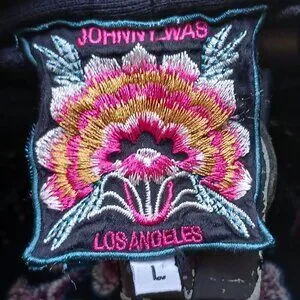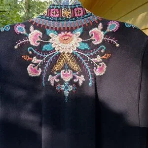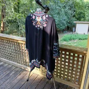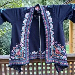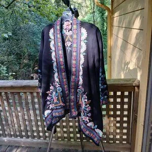 Johnny Was 'Delphine' Draped Cardigan Black Open-Front Cardigan with Vibrant & Intricate Floral Embroidery Sz L