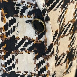 Nice preowned vintage condition. No flaws to note. 100% Silk. Two button closure. Two faux pockets. Houndstooth and gold pattern.