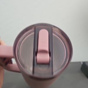 Elegant Stanley travel mug. Rose hue with gold detail. Perfect for on-the-go.