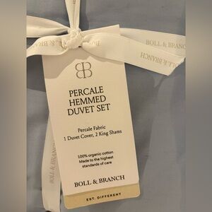 Brand new with tags in box Boll & Branch king sized signature hemmed duvet set in the color hydrangea. Includes duvet cover and two king size shams. 100% cotton percale. Retails for over $400.