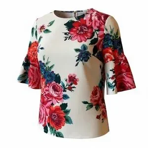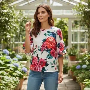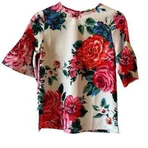 Chic bell sleeve blouse with floral design and vibrant red blooms. Soft cream background. Ribbon tag and exposed gold zipper in back. Perfec for casual elegance.
