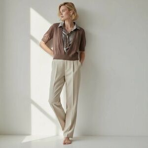 Stylish brown cardigan paired with a sleek gray skirt. Perfect for a casual or chic look.