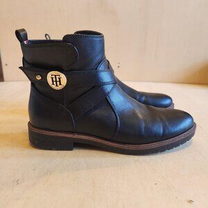 Great looking Tommy Hilfiger women's black Fennie ankle boot. Size 9.5 M. Strappy details and signature gold hardware make the Tommy Hilfiger Fennie lug sole bootie the perfect addition to your wardrobe. Features an almond toe and side zip closure. 1.3" heel height. EUC, looks brand new! ... Comes from a non-smoking home. Does not come with original box.