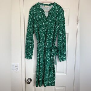 Chic green dress with a stylish pattern. Long sleeves and a flattering tie waist.