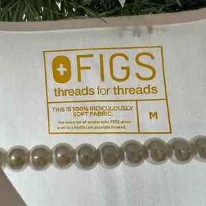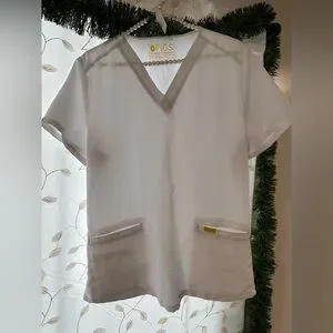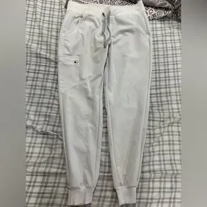 White short sleeve scrub top and white jogger pants both M. Slight makeup stain on left shoulder of top as shown in last photo. Worn one.
